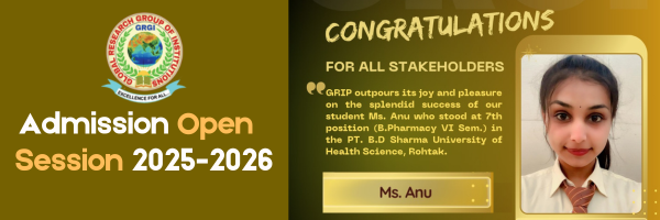 We proudly congratulate Ms. Anu, a B. Pharmacy VII Semester student at Global Research Institute of Pharmacy, Radaur, for securing the 7th position in the B. Pharmacy VI Semester examination conducted by Pt. B.