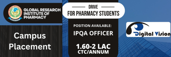 We are excited to announce a Campus Placement Drive exclusively for Pharmacy students at Global Research Institute of Pharmacy (GRIP). 🧪 Position: IPQA Officer 🏢 Company: Digital Vision 💰 CTC: ₹1.60 – ₹2.00 LPA 📅 Date: June 09,