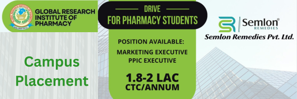 Global Research Institute of Pharmacy is pleased to announce a Campus Placement Drive in association with Semlon Remedies Pvt. Ltd. for Pharmacy students. ✨ Job Roles: 🔹 Marketing Executive 🔹 PPIC