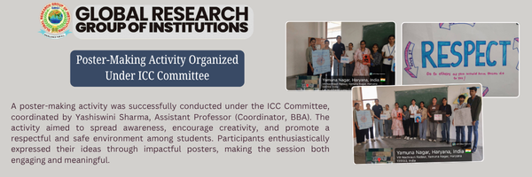 A poster-making activity was successfully conducted under the ICC Committee, coordinated by Yashiswini Sharma, Assistant Professor (Coordinator, BBA). The activity aimed to spread awareness, encourage