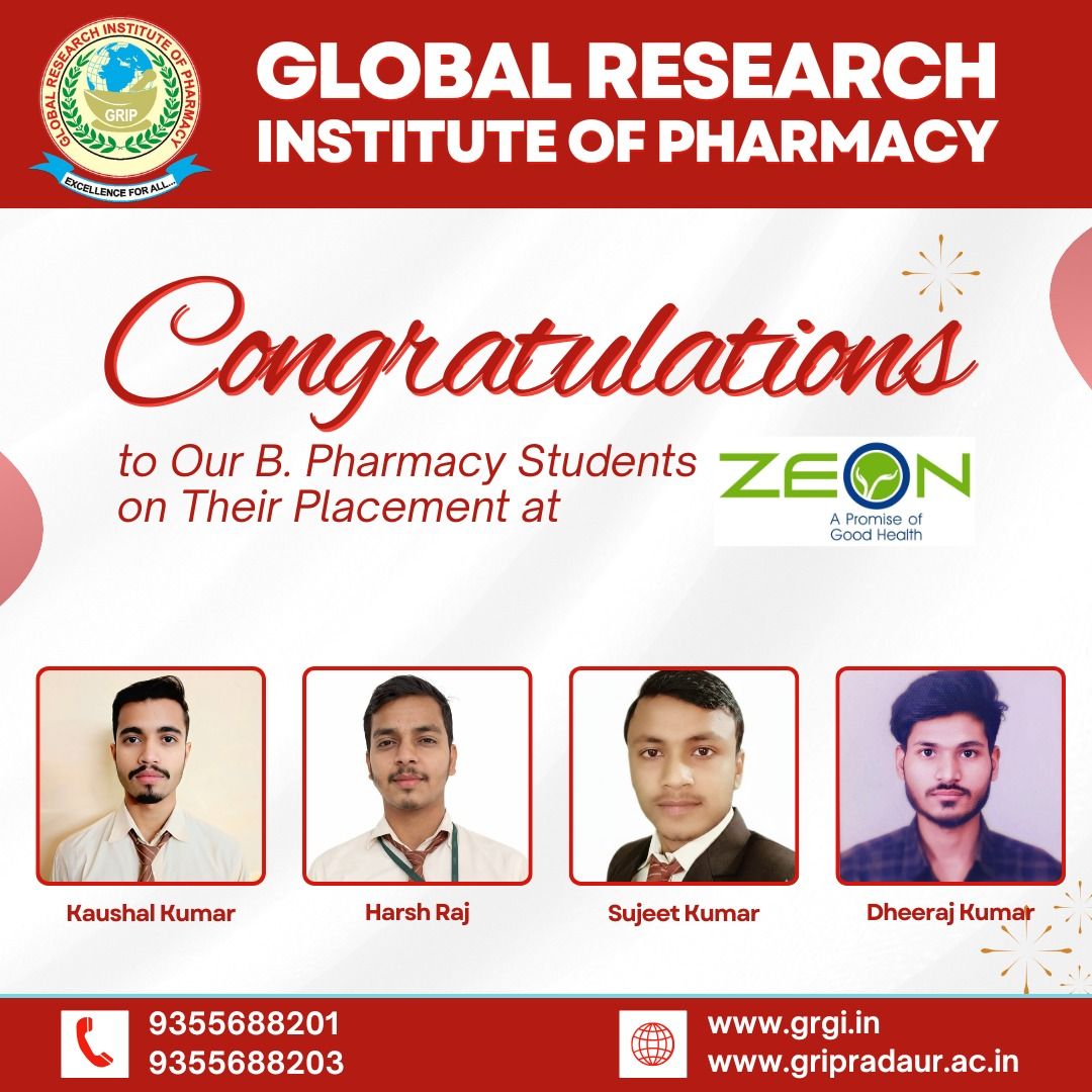 Global Research Institute of Pharmacy proudly congratulates its B. Pharmacy students on their successful placement at IGGS Healthcare. Heartiest congratulations to Dheeraj Kumar, Sujeet Kumar,