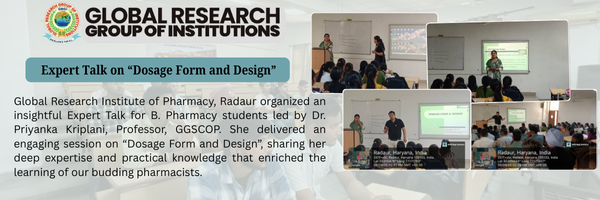 Global Research Institute of Pharmacy, Radaur organized an insightful Expert Talk for B. Pharmacy students led by Dr. Priyanka Kriplani, Professor, GGSCOP. She delivered an